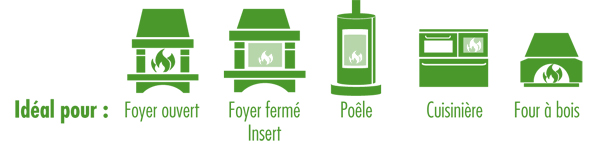 Leur combustion procure une belle flamme grâce au résineux qui n’encrassent pas le foyer, car son taux d’humidité est très faible. Les bois utilisés sont d’origine française.