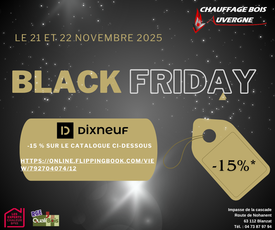 Et si vous profitez du BLACK FRIDAY pour effectuer vos cadeaux de Noel. Les 21 et 22 NOVEMBRE 2025 CHAUFFAGE BOIS AVERGNE vous fait bénéficier d’une REMISE EXCLUSIVE pendant seulement 2 JOURS : -15%* (billets) sur les accessoires du catalogue ci-dessous. https://online.flippingbook.com/view/792704074/12/ , * voir conditions en magasin.